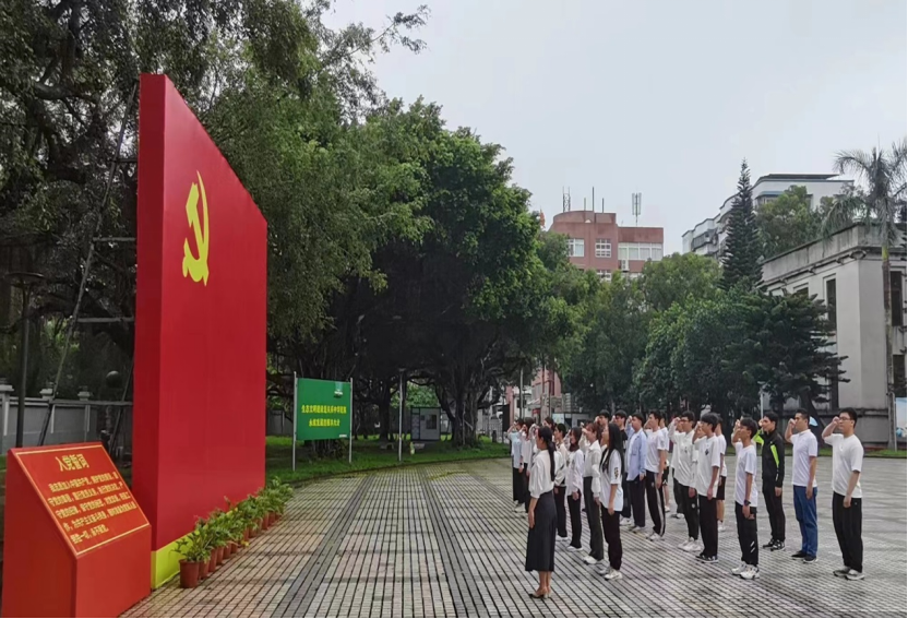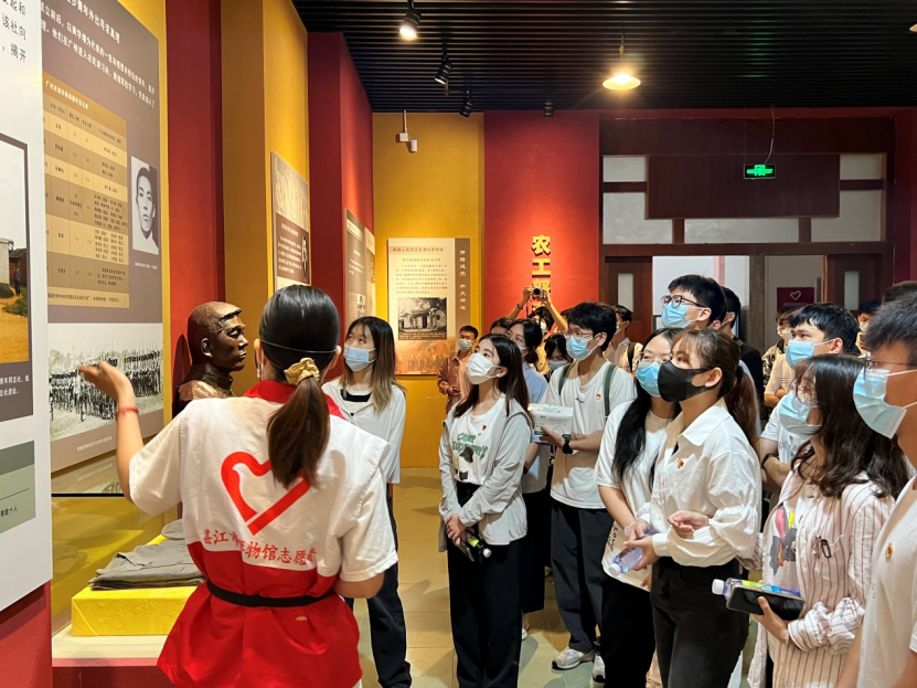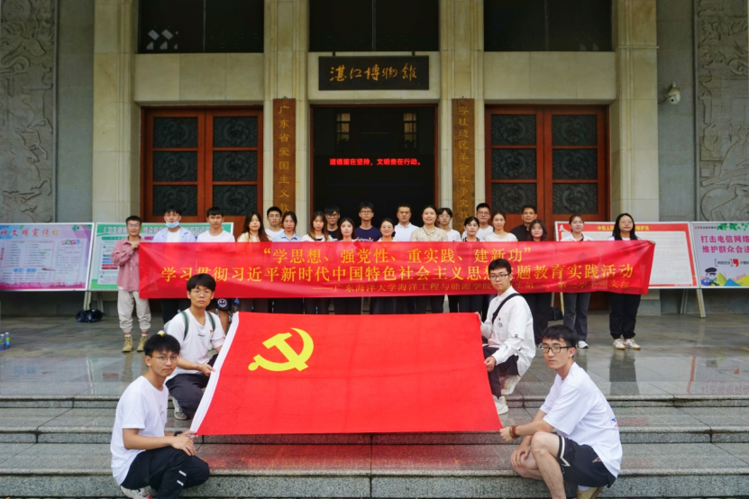 在湛江市博物馆门口的党旗下,第二学生党支部书记何凤梅带领两个学生党支部党员,面向党旗隆重宣誓,重温了入党誓词。随后在讲解员的带领下党员们参观了湛江市博物馆的《粤桂边区革命斗争史展览》、《从广州湾到湛江--湛江开埠百年历史展览》等展厅,大家深入学习了上世纪二十年代,湛江各级党组织和运动领袖领导广大人民群众,在革命运动的历史进程中创造了无数辉煌业绩,涌现出大批革命英雄,南路农民领袖黄学增等革命先烈的事迹深深打动了党员们的心。湛江市在党的领导下百年历史巨变,近十年发展日新月异,在场同志们深刻领悟习近平新时代中国特色社会主义思想的真理力量和实践伟力,进一步激发爱党爱国热情,凝聚团结奋进力量。