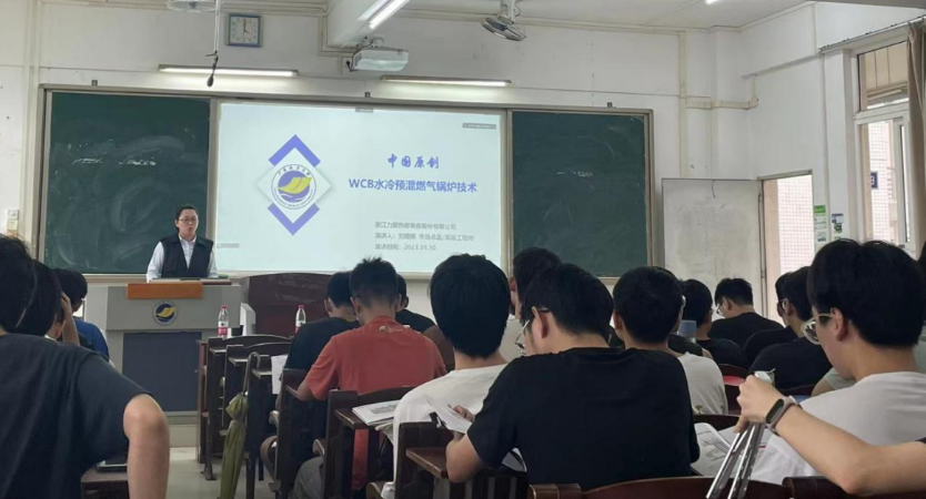 其次,刘楠楠总监还为我院建筑环境与能源应用工程专业2020级本科生开展锅炉主体讲座。刘总监介绍了锅炉的应用领域,像机场,高校,银行,商场,医院,办公楼等集中供热等与生活息息相关的场所,用途十分广泛。由浅入深,分别从热水锅炉的基本分类和不同燃烧方式的优缺点为学生介绍了我国原创的先进的水冷预混燃气锅炉技术,及其相关的热源设备,并展示了公司的先进无人自动化生产流程。相较书本上介绍的基础的,较落后的热源设备,本次交流和讲座为师生提供了一次充分了解市场先进热源设备的机会,激发学生接下来对于专业冷热源设备知识的学习兴趣,提升学生的民族自信心和专业自信心。
