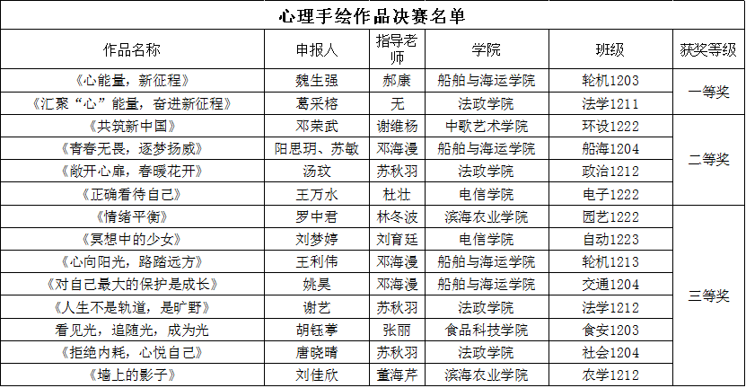 本次活动以“妙笔绘初心”为主题,以心理漫画或心理绘画为表现形式,面向全校学生征集作品。活动邀请了williamhill中文和船舶与海运学院六位老师担任评委,对作品进行评选。截止5月22日,承办方共收到183幅心理手绘作品。经过初赛与决赛,选出一等奖2名,二等奖4名,三等奖8名,共14幅获奖作品。
