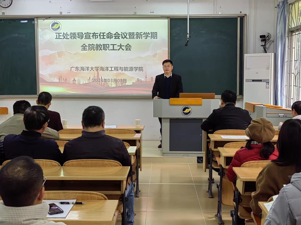 3月3日上午,williamhill中文在海滨校区教学楼202教室召开了正处领导任命暨学院新学期教职工大会。学校党委书记杨洲教授出席会议并讲话,党委组织部曾庆新部长、学院党政领导班子成员及全体教职工参加会议。学院党委书记李国芳主持会议。