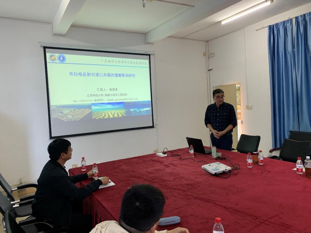 会上高俊亮教授对其领导的研究团队、研究方向、研究条件进行了详细介绍,对丰富的研究成果概括介绍,并针对布拉格反射对港口共振的缓解影响及机理探索研究进行了详细的讲解。
