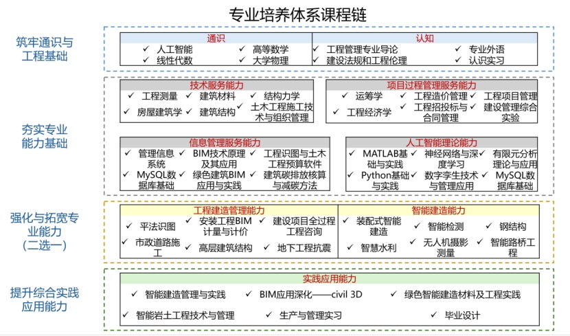 在2025版工程管理专业培养方案中,在满足国家质量标准前提下,大幅度提高了实践类课程学分及占比,建立了完整的“人工智能+智能建造”课程链,设置了14门课程,同时结合海洋工程BIM技术,对《工程估价》、《工程测量》、《工程施工技术与组织管理》等专业课程内容进行大幅度修改。