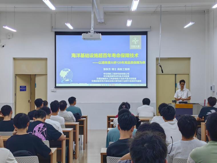 2025年10月22日,中交集团张东方博士为新生开展了“科技改变生活 创新赢得未来——海工混凝土耐久性”专题讲座。讲座以港珠澳大桥为核心案例,张博士详解了港珠澳大桥工程中的四大关键技术,即海洋腐蚀针对性耐久性设计、严格施工工艺与材料筛选、服役期实时监测、科学运维保障,清晰呈现工程全周期技术逻辑,展现现代工程技术的突破与发展。同时,本次讲座探讨了恶劣环境下混凝土耐久性理论应用、结构防腐蚀技术、已建构造物病害整治、修复材料创新等方向,针对海洋环境下结构侵蚀、材料老化等难题,给出了高性能混凝土应用、防腐蚀涂层施工等方案。此次讲座让港口航道专业“耐久性设计”等课本知识具象化,也让工程管理专业新生更容易理解全周期技术逻辑,为教学科研补充鲜活案例。