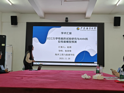 在研究生学术汇报环节,五位研究生展示了他们的研究成果。徐锦涛同学以《多源数据驱动的CNN-Transformer混合模型用于热带印度洋风能数据库重构》为题,探讨了如何通过混合模型有效修正再分析数据的系统性偏差问题。赵琪同学系统研究了不同纤维类型与掺量对ECC材料性能的影响,发现PE纤维在提升材料性能方面效果最优。高翼同学针对海流干扰下欠驱动AUV的控制问题,提出了自适应反步控制策略,并通过仿真验证了其有效性。黄炜轩和罗智洵分别分享了关于水泥基磁电复合材料特性研究和基于TPE-LSTM的水下机器人动力学建模的研究成果。这些报告展现了学院研究生扎实的研究能力和跨学科的研究视野。