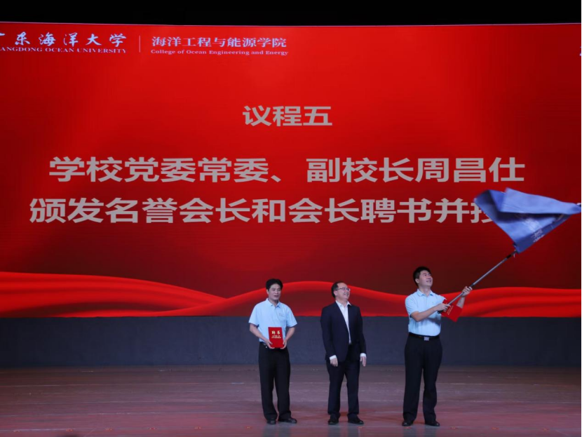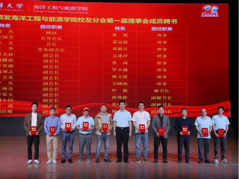 会上,学院院长徐青公布了校友分会第一届理事会成员名单。随后,周昌仕副校长为荣誉会长李国芳、会长徐青颁发聘书并授予分会会旗。飘扬的旗帜,承载着全体海能人的使命与担当。现场还分批次进行了顾问、常务副会长、副会长、理事及秘书长、副秘书长的聘书颁发仪式,李国芳、徐青、吴光林、冯耀勋等分别为相关成员颁发聘书,一张张聘书既是信任的托付,更是责任的传承。