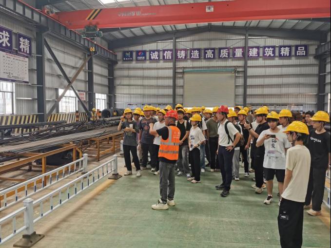 佩戴好安全帽进入施工现场后,师生们在钢筋加工区看到各类自动化设备有序运转,醒目的安全警示标志遍布作业区域。项目经理详细讲解了钢筋调直机、弯曲机等设备的操作流程与规范,并特别指出:“为践行绿色施工理念,我们专门设置了废料回收区,对边角料进行分类处理和资源化利用。”这一举措在降低施工成本的同时,也体现了环保理念,让同学们直观感受到现代工程建设中“安全、环保、高效”三位一体的管理模式。